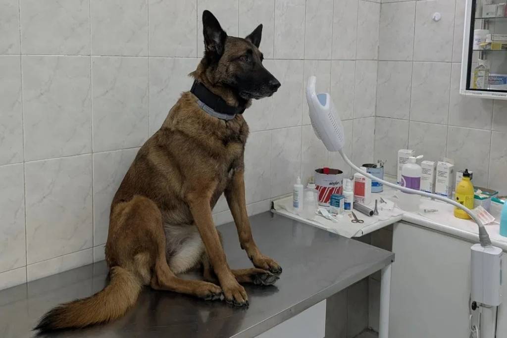 Un Belusky assis sur une table et portant un collier autour du cou