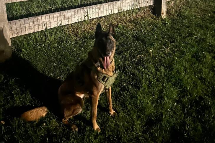 Un Belusky assis sur un terrain herbeux et portant un harnais
