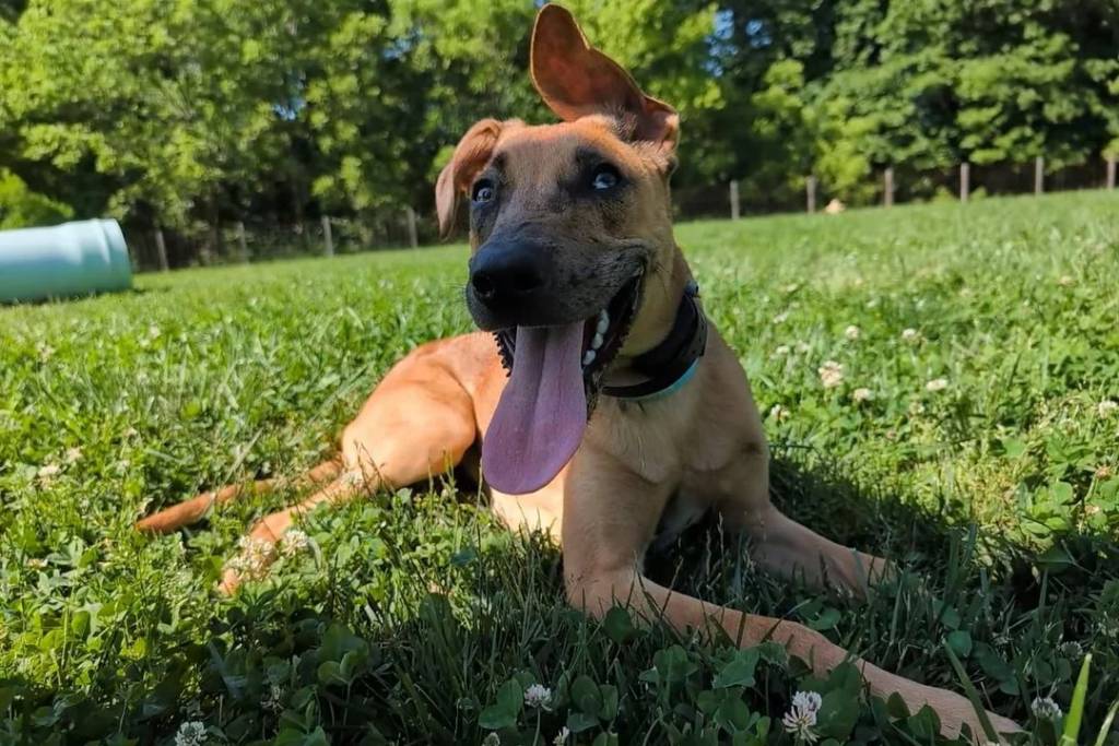 Un Belusky allongé portant un collier autour du cou et tirant la langue