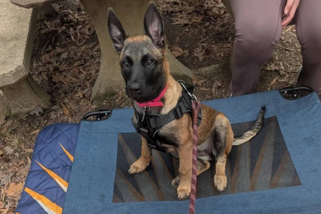 Un Belusky assis sur un brancard portant un harnais et tenu en laisse