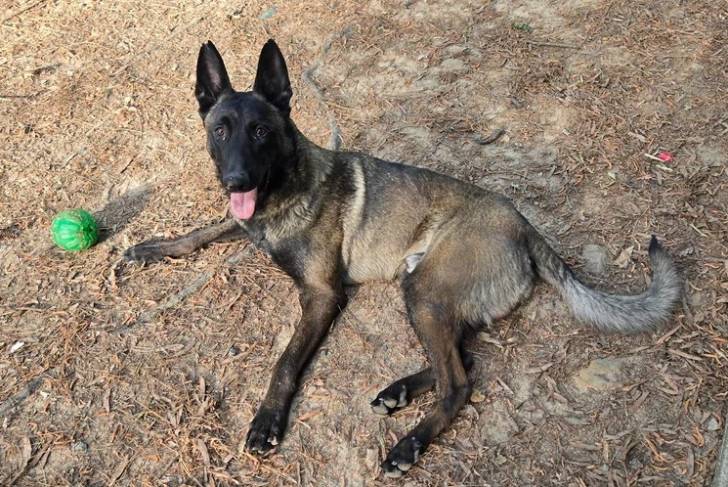 Un Belusky allongé sur un terrain herbeux et tirant la langue