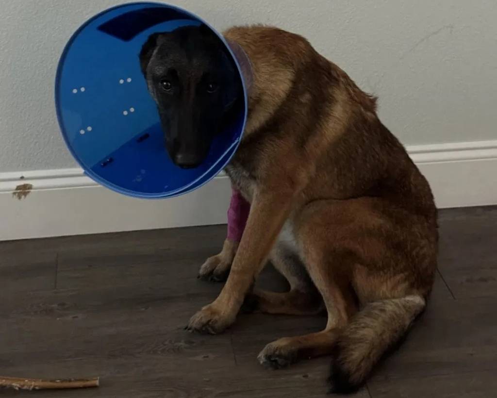 Un Belusky assis sur un parquet et portant un carcan sur la tête