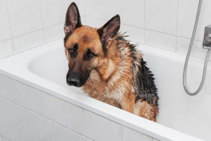 Un Berger Allemand qui prend son bain dans une baignoire