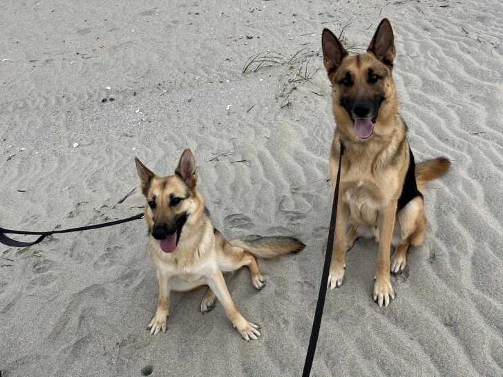 Deux Berger Allemand assis sur une surface sableuse et qui sont tous deux tenus en laisse
