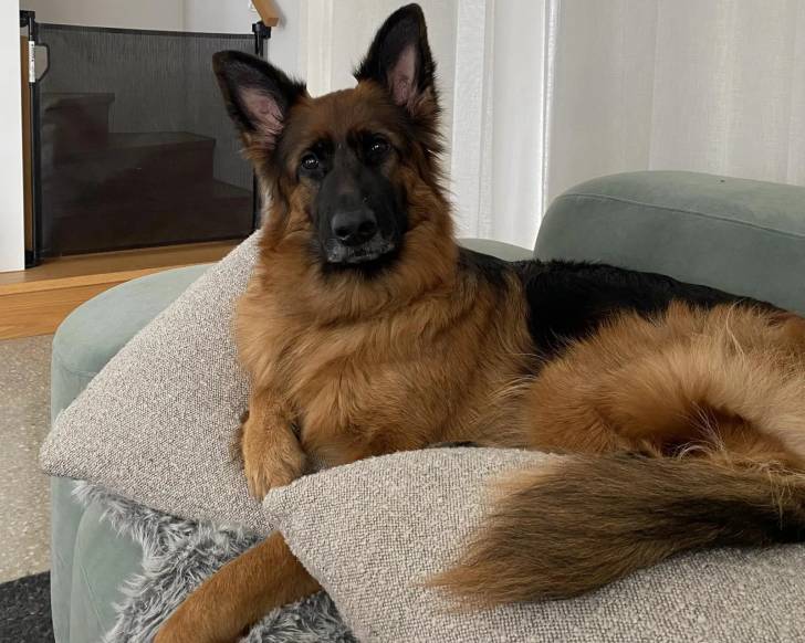 Un Berger Allemand allongé sur un canapé et regardant vers la caméra