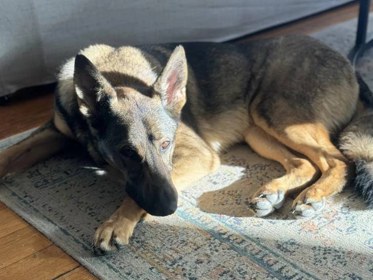 Un Berger Allemand allongé sur un tapis et regardant vers la caméra
