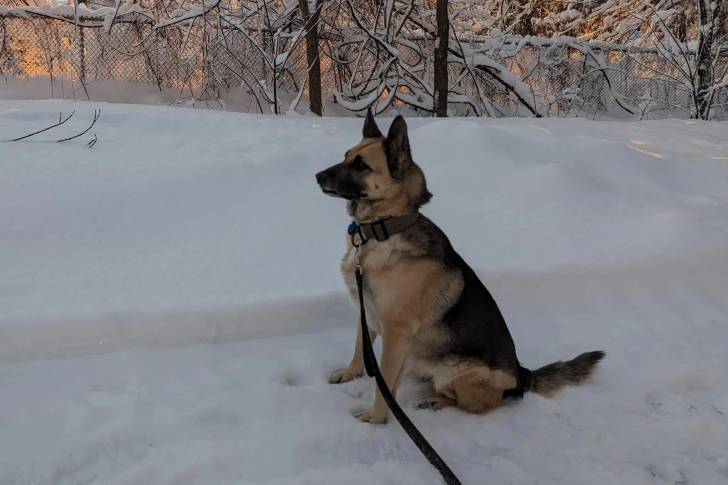 Un Berger Allemand assis sur une surface enneigée et qui est tenu en laisse