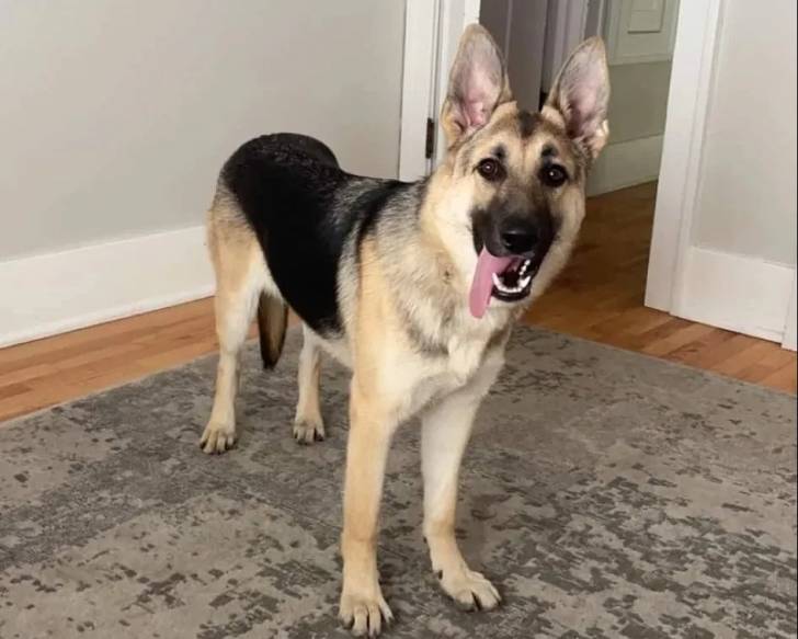 Un Berger Allemand sur un tapis et ayant la langue pendante