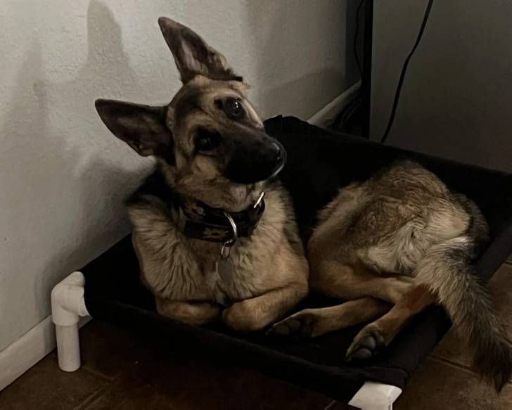 Un Berger Allemand allongé sur un lit pour chien et portant un collier autour du cou