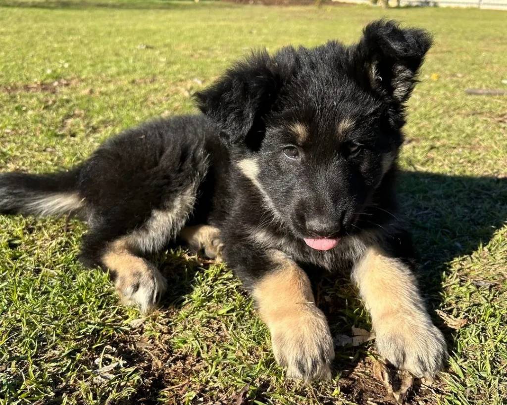 Un Berger Allemand allongé sur un terrain gazonné et tirant légèrement la langue