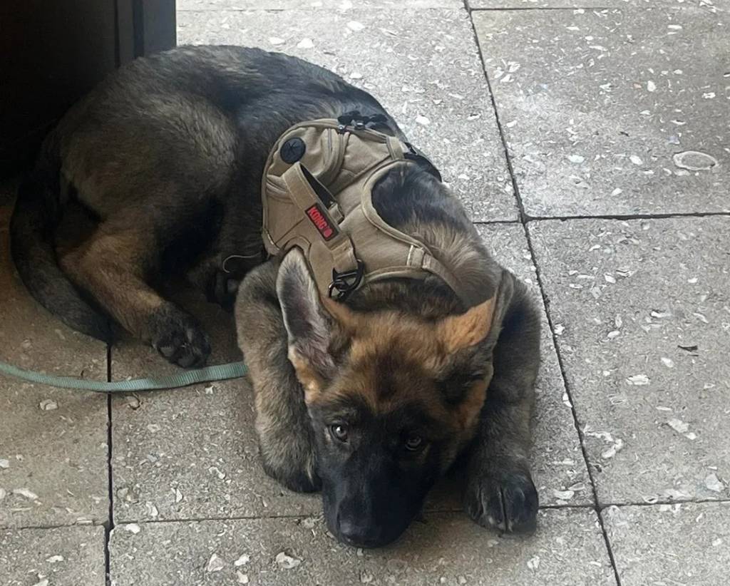 Un Berger Allemand allongé sur un sol carrelé et portant un harnais