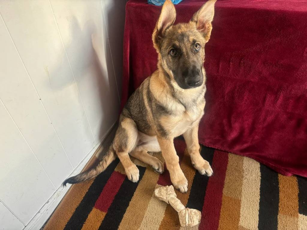 Un Berger Allemand assis sur un tapis et regardant vers la caméra