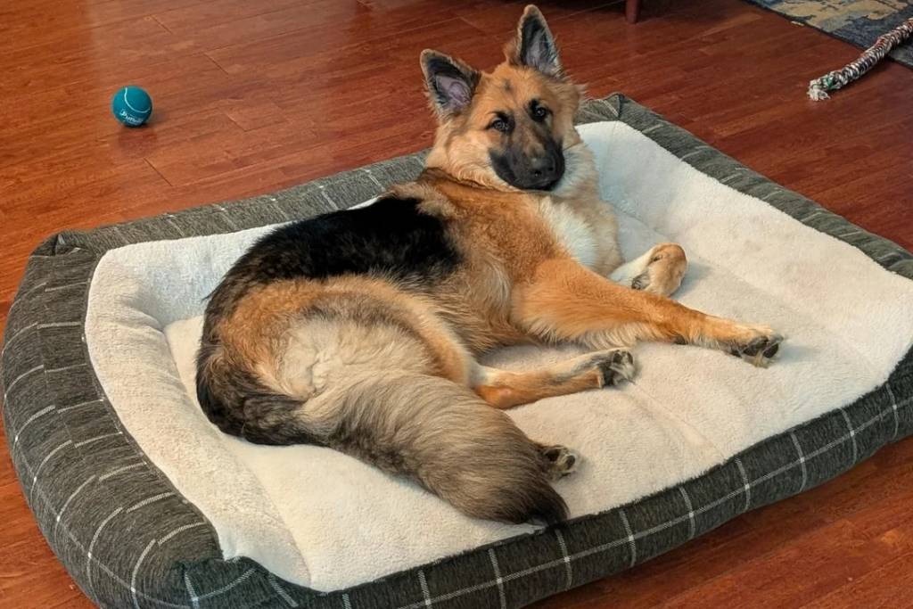 Un Berger Allemand allongé dans un panier et regardant vers la caméra
