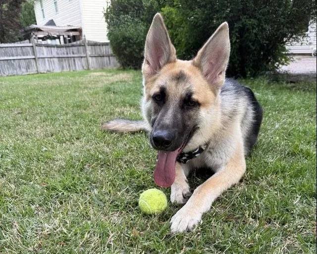 Un Berger Allemand allongé sur un terrain herbeux et tirant la langue
