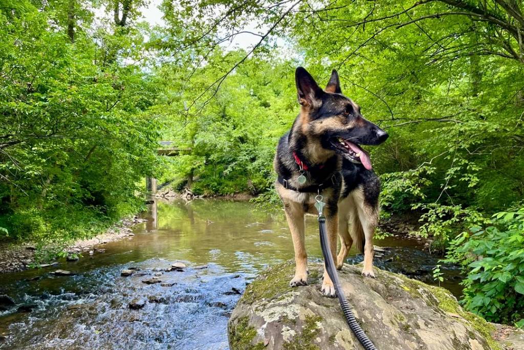 Un Berger Allemand tirant la langue pendante et tenu en laisse