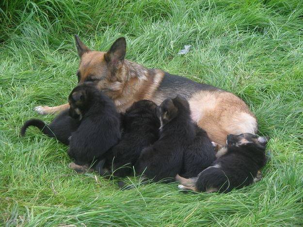 Voici mes 7 chiens (sur 8). Il y a la femelle qui fait allaiter ses chiots qui s'appelle Ellys avec ses 6 chiots, 4 mâles nommés Hasko, Henzo, Hifi et Hity, et 2 femelles nommées Haby et Hazer. La femelle (mère des chiots) a 2 ans et demi et les chiots ont 2 mois (ils sont nés le 08/02/12). Je vais garder tous les chiots. Ils sont trognons !!!