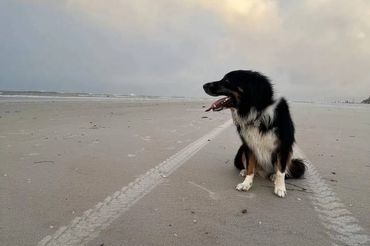Un Berger Anglais assis sur une surface sableuse et portant un collier autour du cou