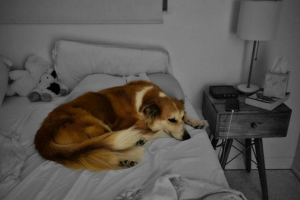 Un Berger Anglais allongé sur un lit et semblant détendu