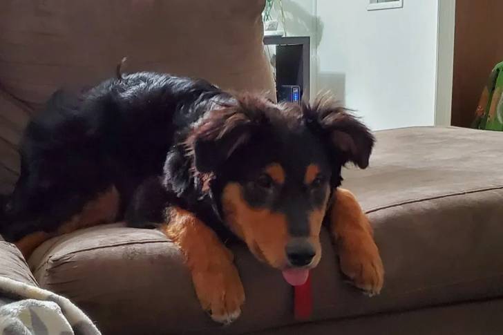 Un Berger Anglais allongé sur un canapé et tirant la langue