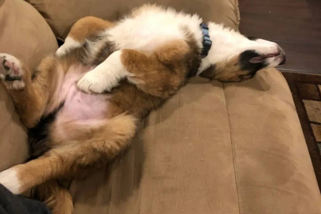Un Berger Anglais allongé sur le dos sur un canapé et portant un collier autour du cou