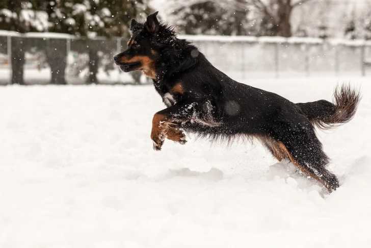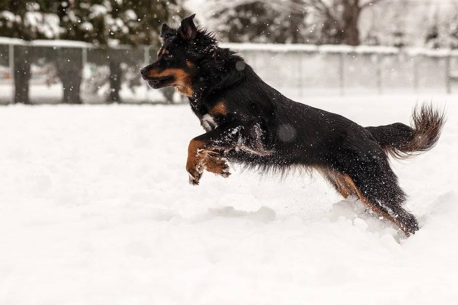 Un Berger Anglais courant sur une surface enneigée