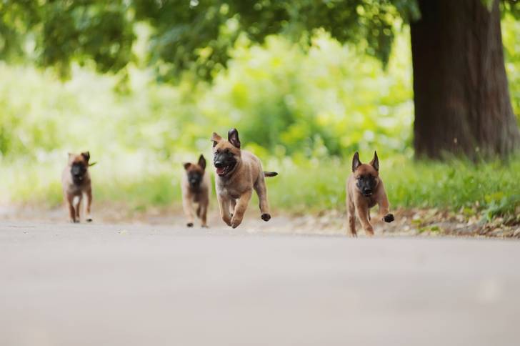 Plusieurs chiots Malinois qui courent sur une route