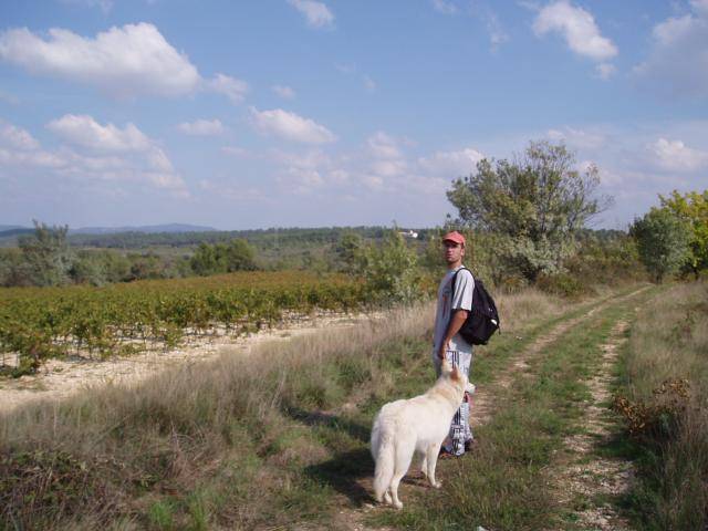 avec mon maitre....on parcours entre 8 et 15km par jour , à travers vignes, garrigues, sous-bois dans ce beau departement qu'est l'herrault!