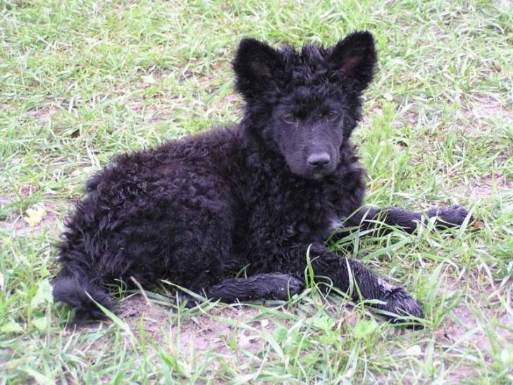 Quatre chiots Berger Croate partagent paisiblement leur repas