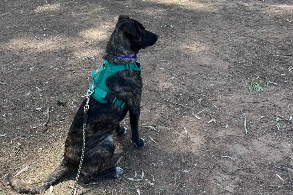 Un Berger Hollandais assis sur un terrain herbeux et qui est tenu en laisse