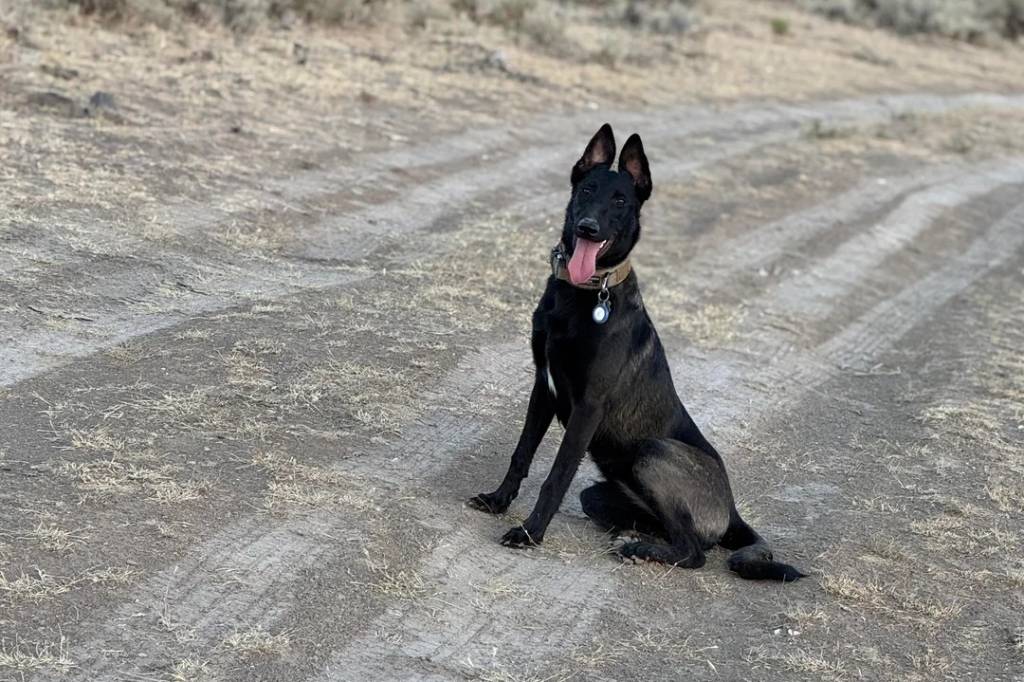 Un Berger Hollandais ayant la langue pendante et portant un collier autour du cou