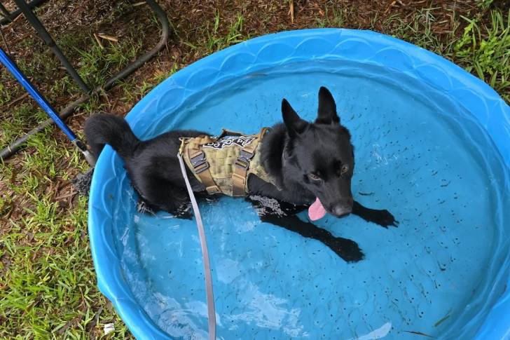 Un Berger Hollandais ayant la langue pendante et qui est tenu en laisse