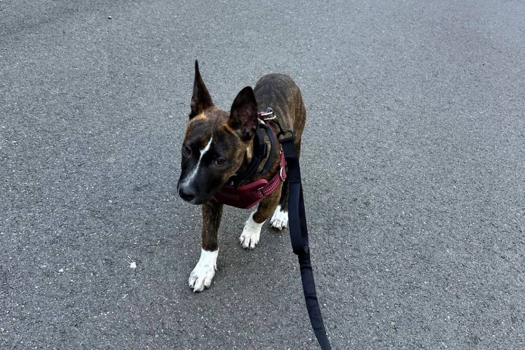 Un Berger Hollandais sur une surface bitumée et qui est tenu en laisse