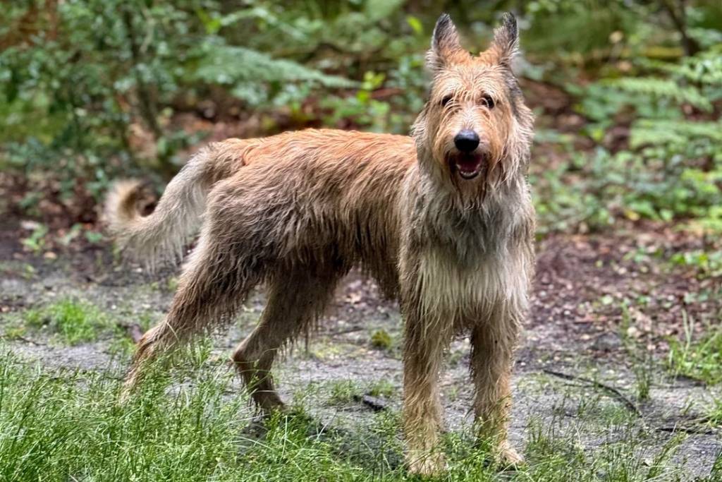 Un Berger Picard sur un terrain herbeux et ayant la gueule ouverte