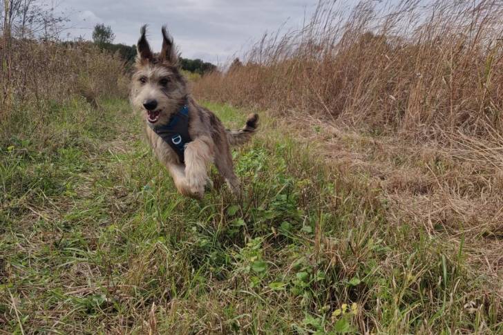 Un Berger Picard courant sur un terrain herbeux et portant un harnais