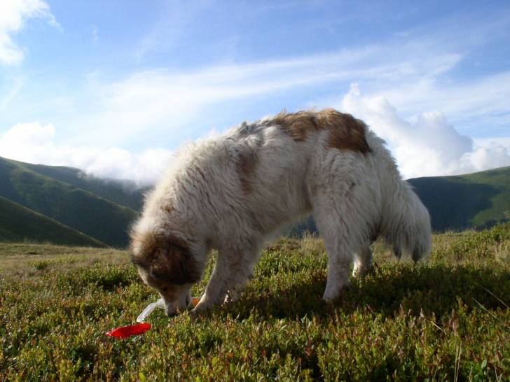 Un Berger Roumain des Carpathes perturbé par une tondeuse alors qu'il monte la garde
