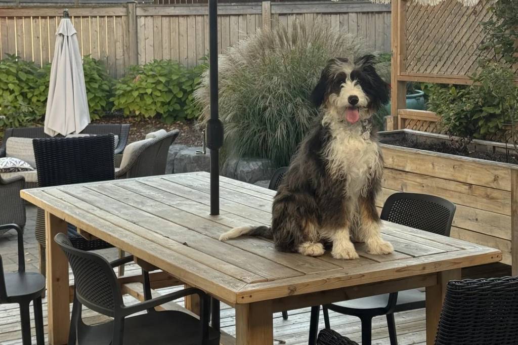 Un Bernedoodle assis sur une table et ayant la langue pendante