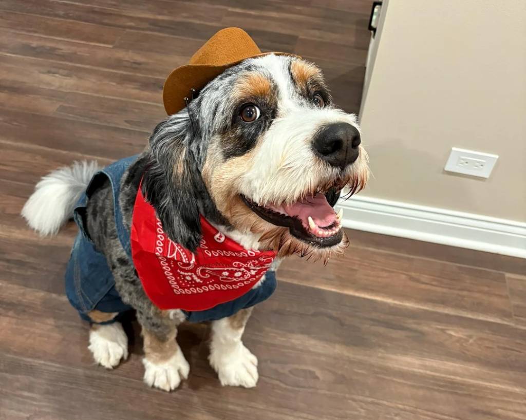Un Bernedoodle assis sur un plancher et portant un foulard autour du cou