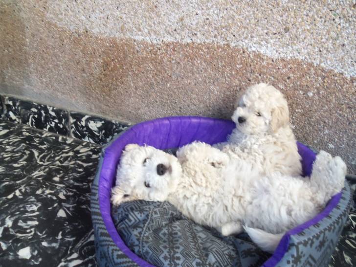 Des chiots Bichons Frisés d'un mois jouent ensemble