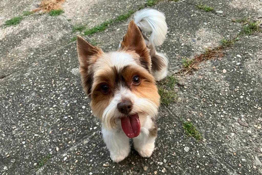 Un Biewer Yorkshire sur une surface bétonnée et ayant la langue pendante