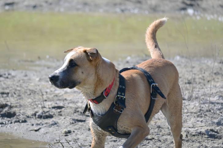Un Black Mouth Cur portant un harnais et se promenant sur un terrain marécageux.
