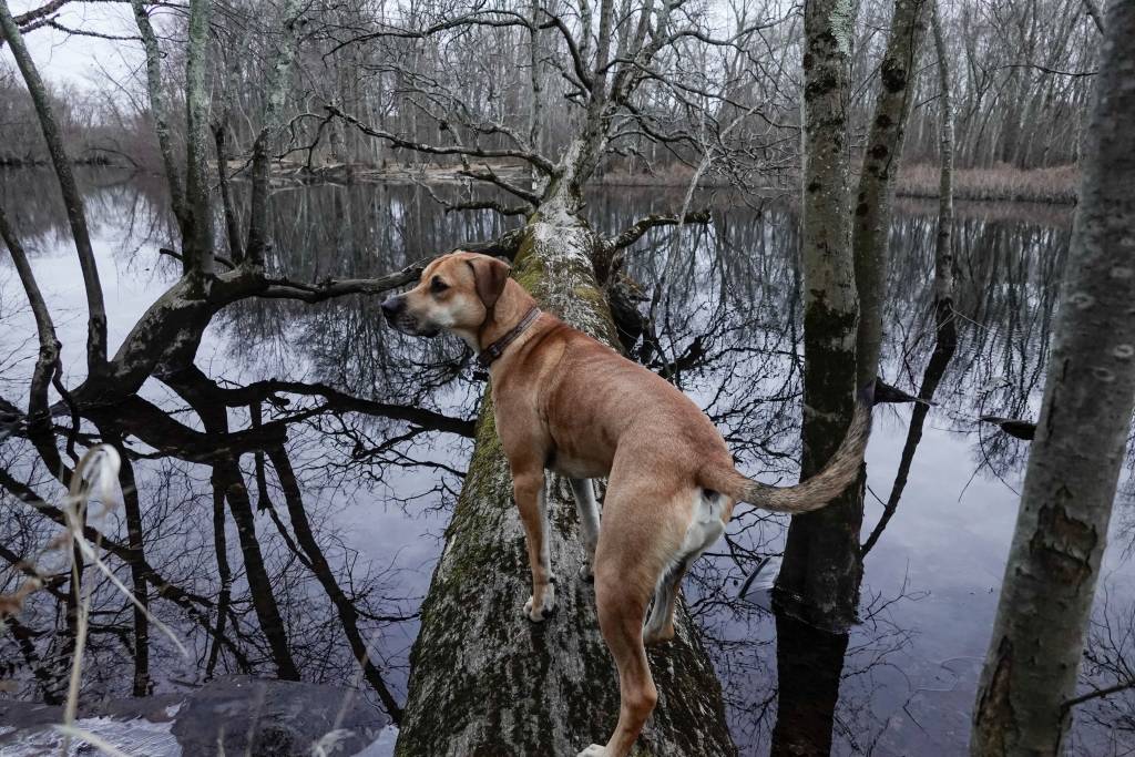 Un Black Mouth Cur qui s'apprête à marcher sur un tronc d'arbre renversé pour traverser un lac.