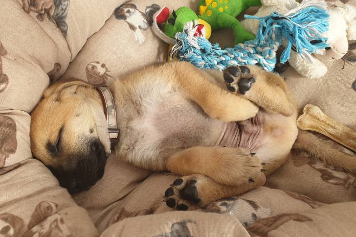 Un bébé Black Mouth Cur dort profondément dans son panier, sur le dos et entouré de ses peluches.