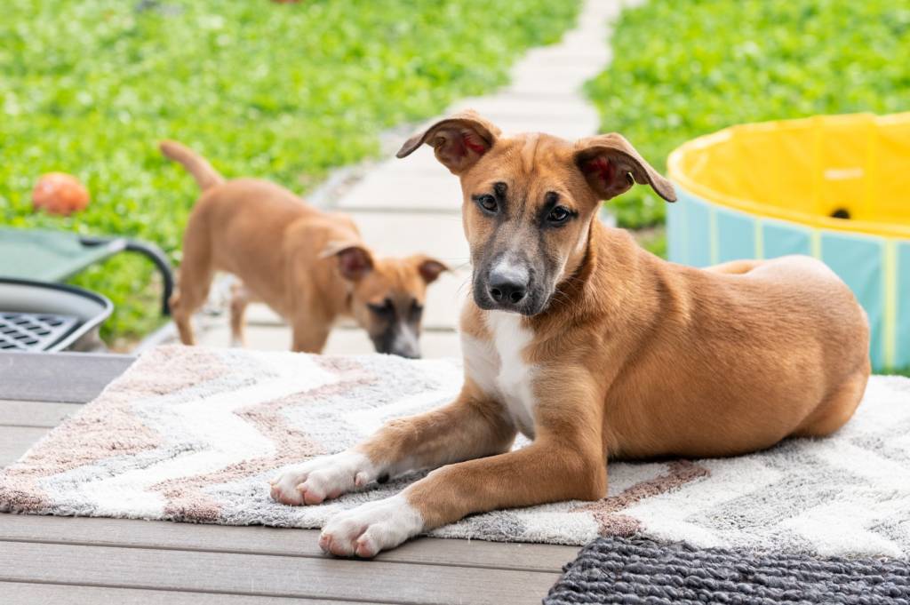 Un adulte Black Mouth Cur allongé sur la devanture d'une maison avec un autre derrière qui s'amuse dans le jardin.