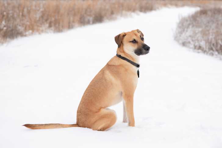 Un Black Mouth Cur adulte aux poils de couleur fauve est assis seul au milieu de la neige