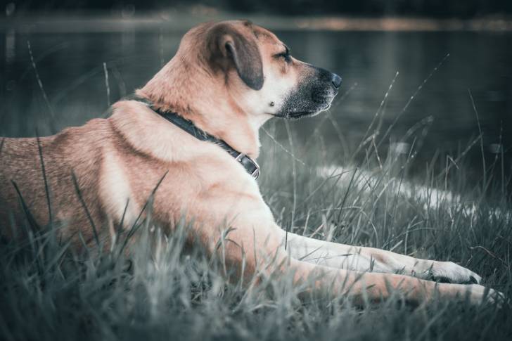 Un Black Mouth Cur adulte allongé dans les herbes hautes au bord d'un lac.