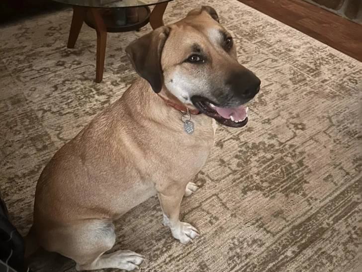 Un Black Mouth Cur assis sur un tapis et portant un collier autour du cou