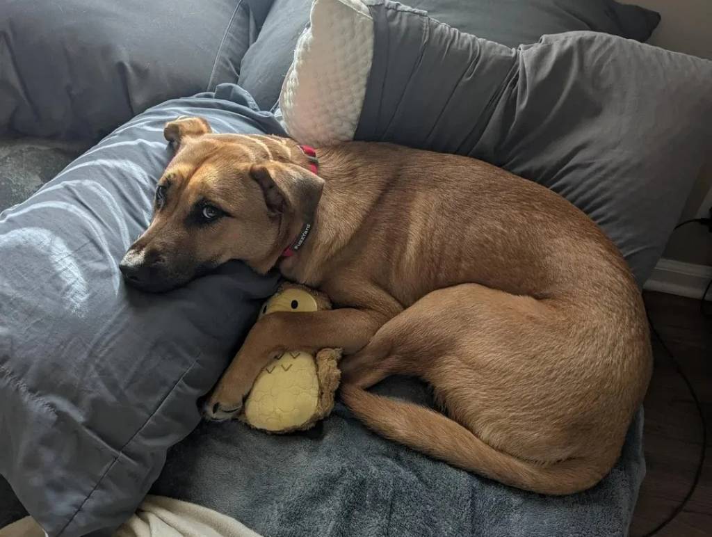 Un Black Mouth Cur allongé et portant un collier autour du cou
