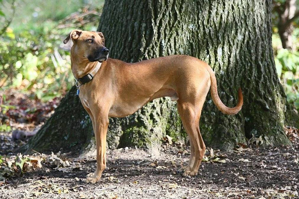 Un Black Mouth Cur devant un arbre et portant un collier autour du cou