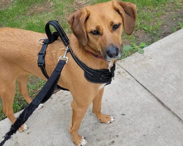Un Black Mouth Cur sur une surface bétonnée et qui est tenu en laisse