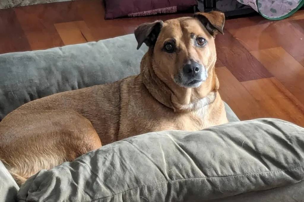 Un Black Mouth Cur allongé sur un fauteuil